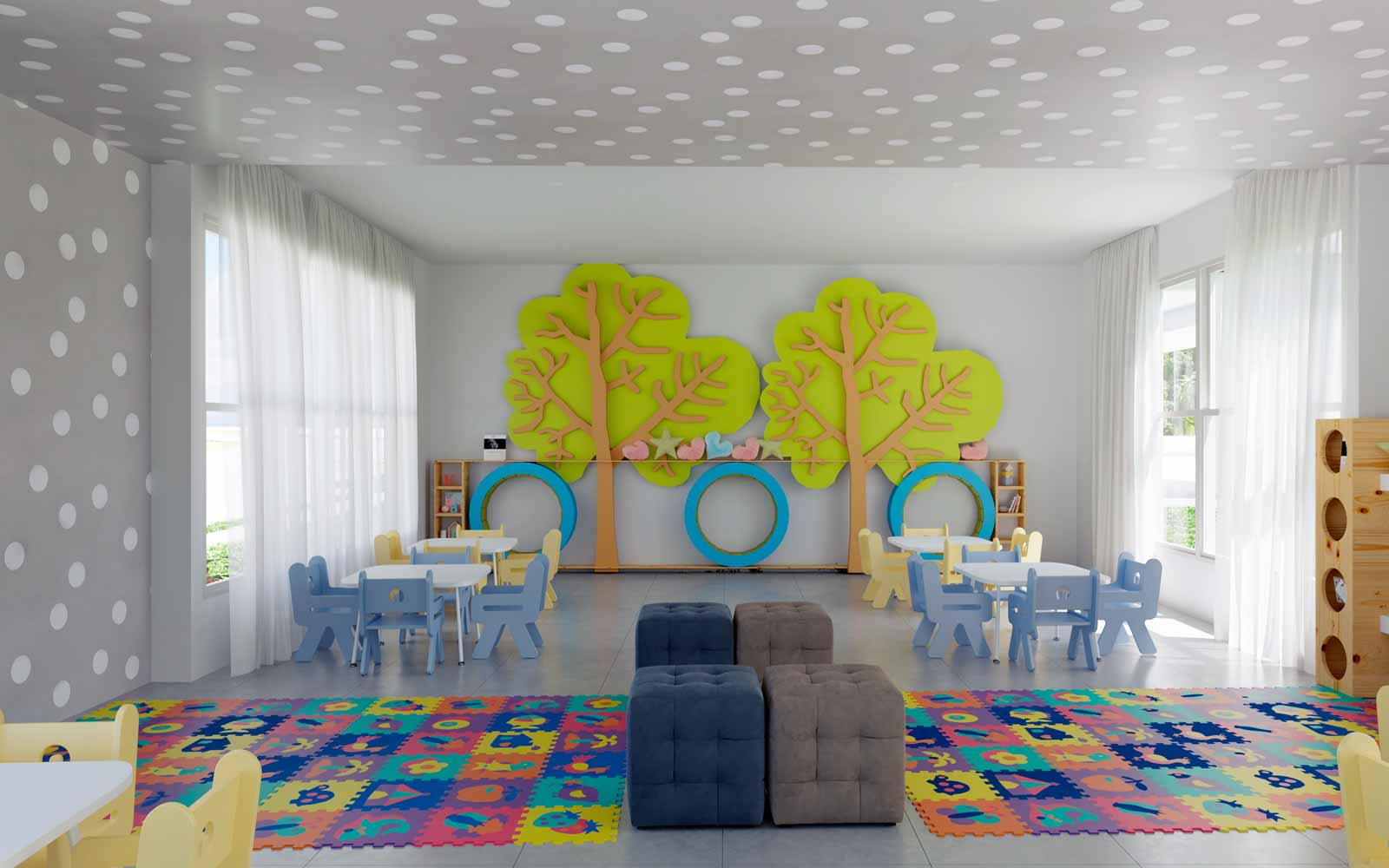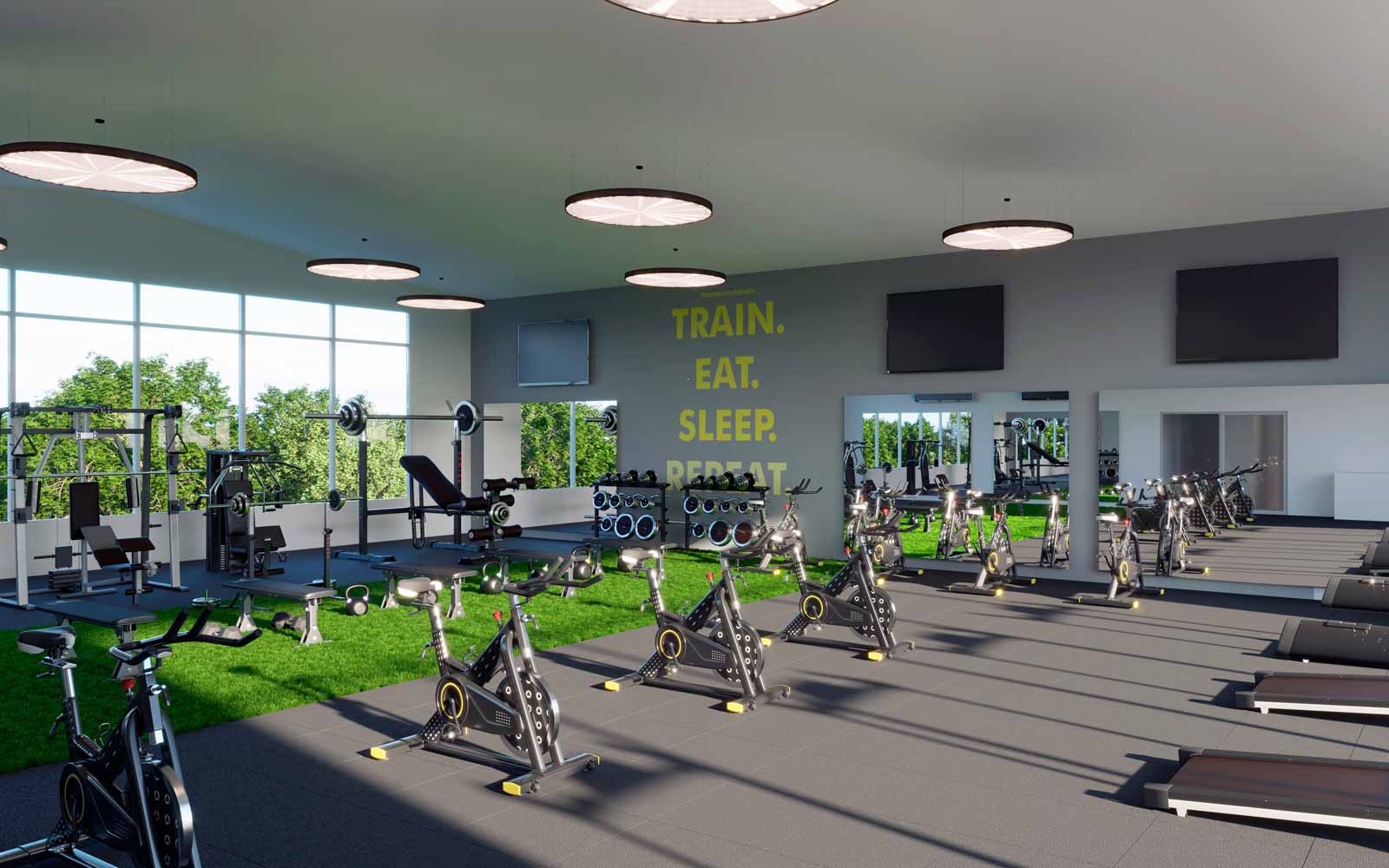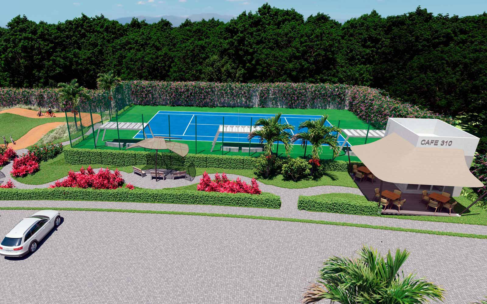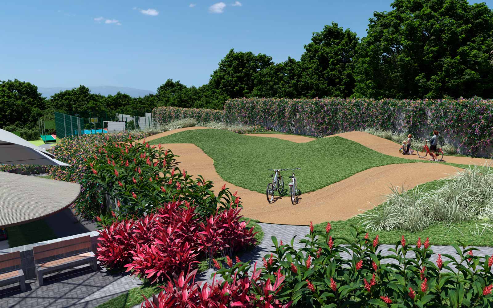 Recreational swimming pool, 2 clubhouses, game room, lounge bar, coworking space, dog park, BBQ terrace, massage room, lush green areas, spa with thermal sauna, Turkish bath and jacuzzi, rooftop social area with firepit and projector, convenience store, 5-a-side soccer field, tennis court, multi-sport court, crossfit area, semi-Olympic pool, fully equipped gym, pilates room, BMX-style bike track, physiotherapy office, children’s play areas, kids’ recreational pool and water park, daycare center.