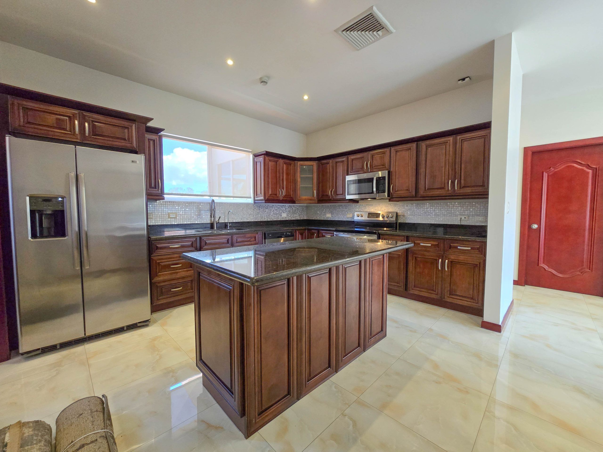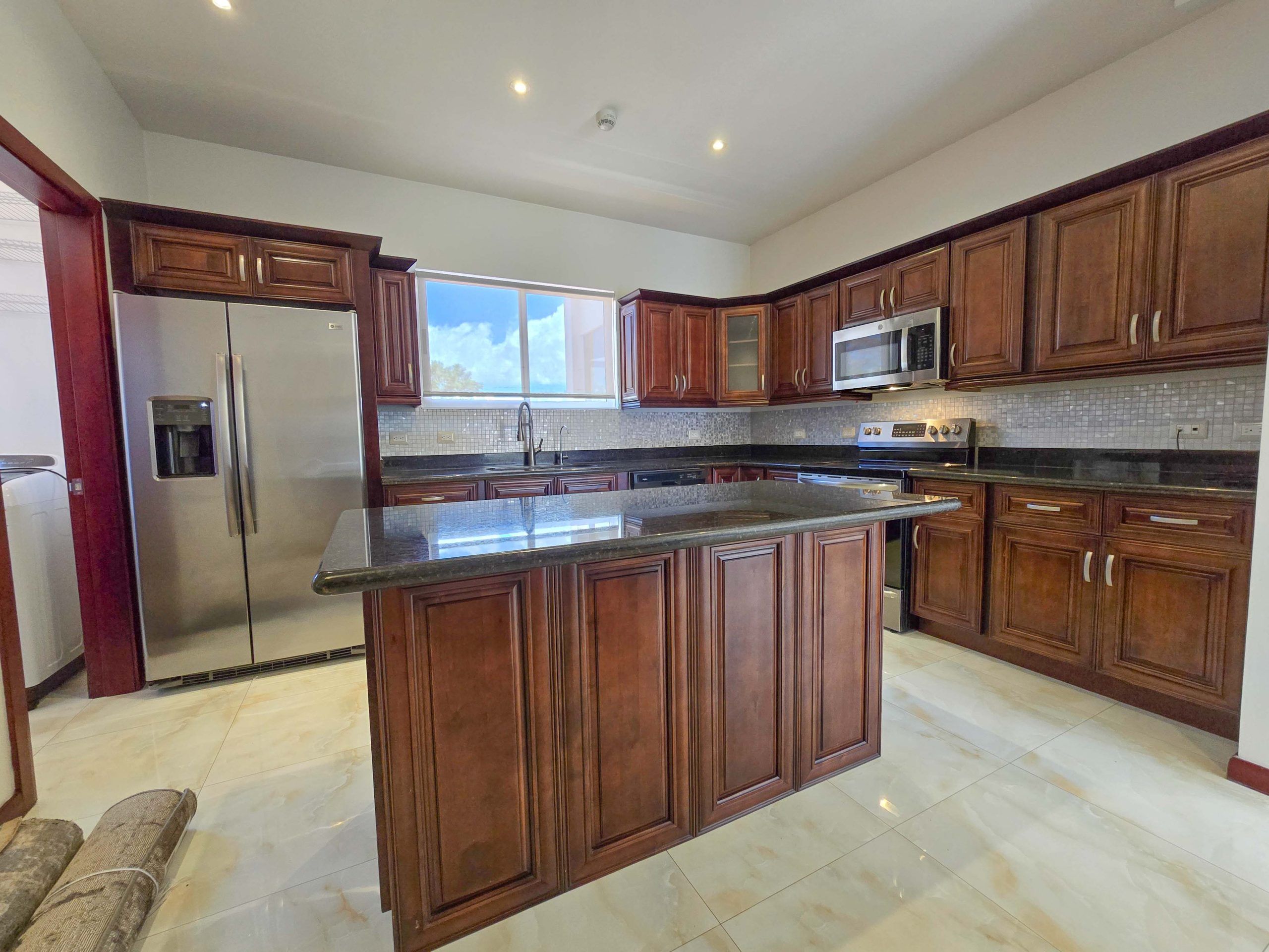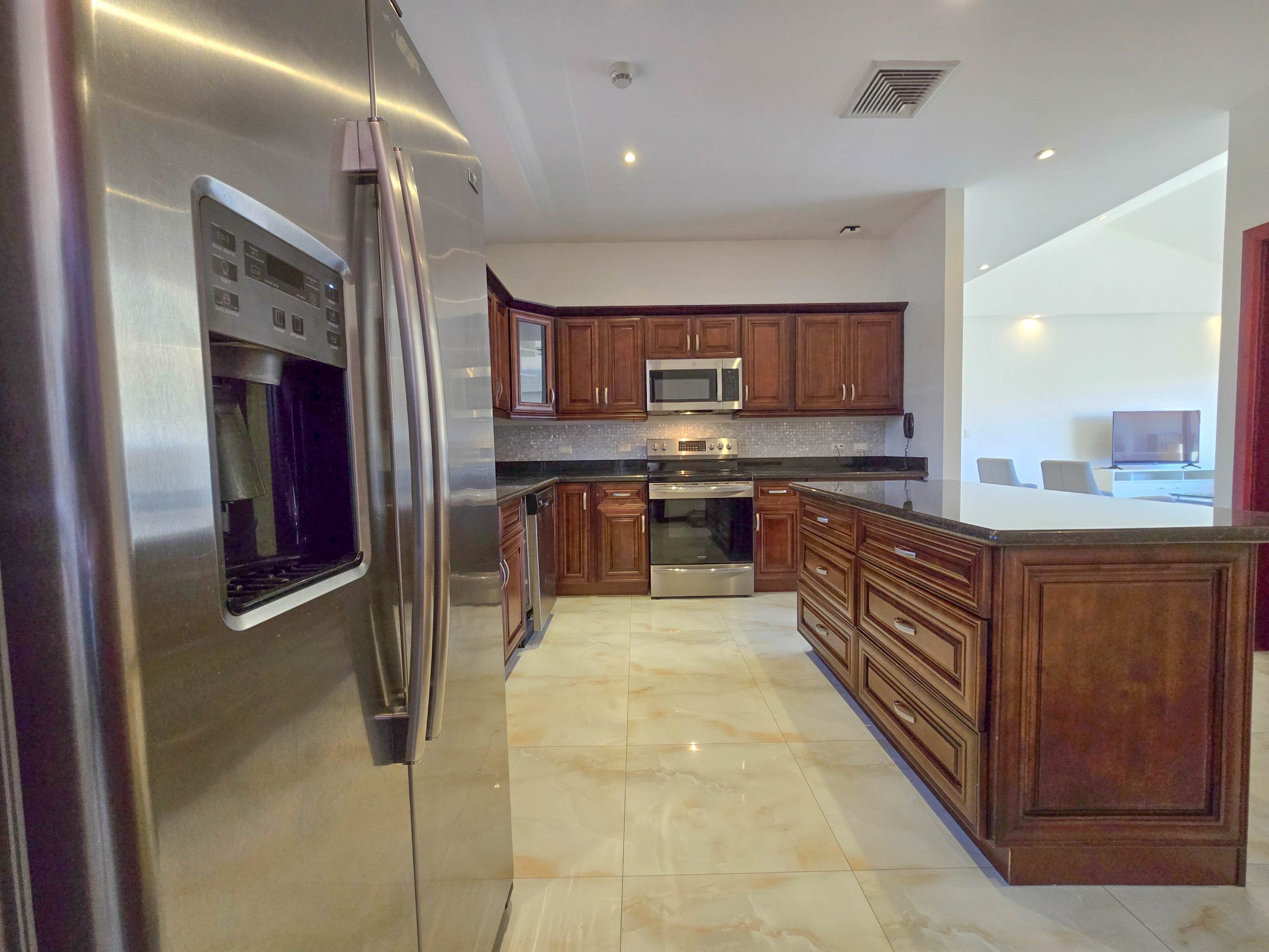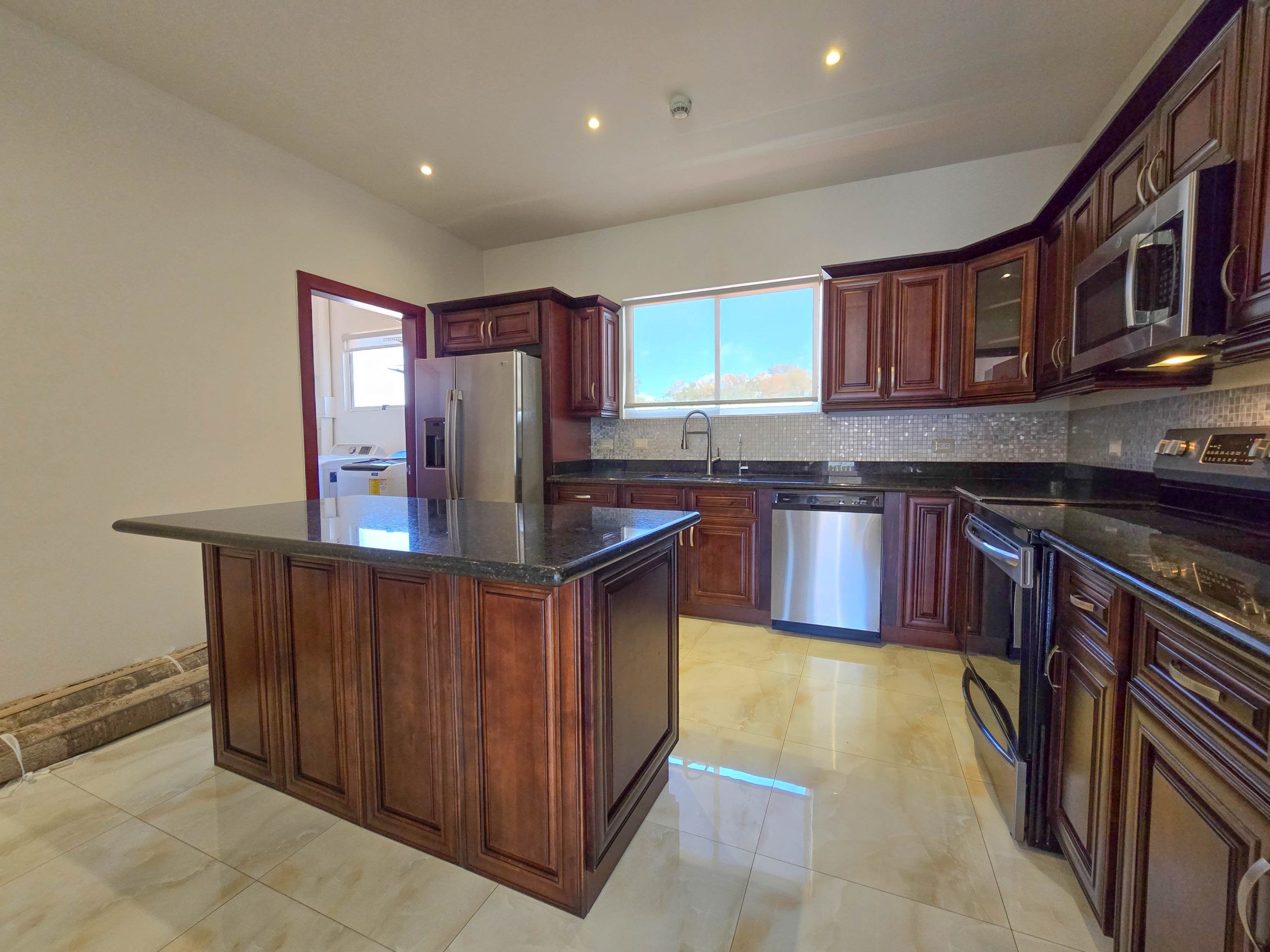 - Cocina con sobres en granito y línea blanca, isla desayunador.