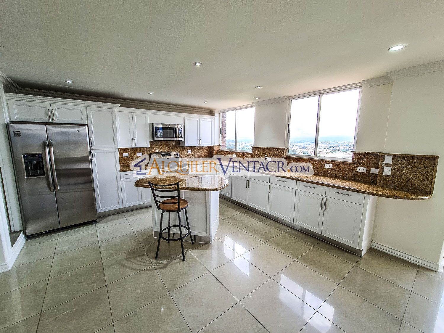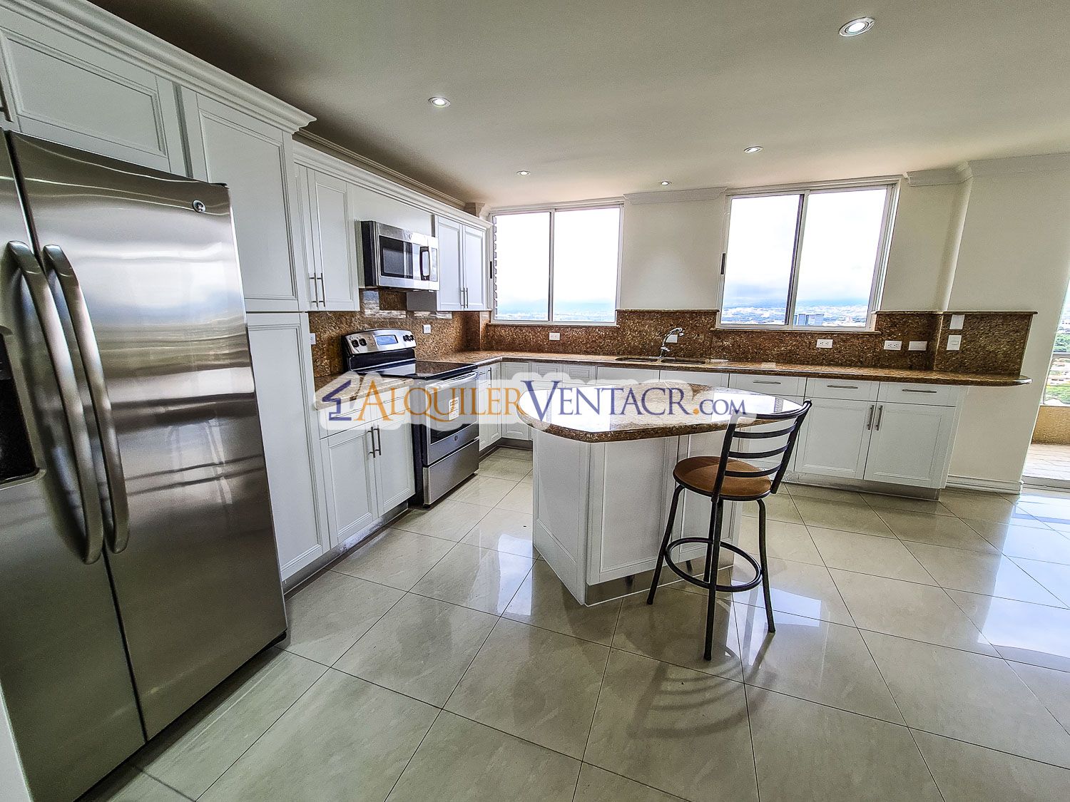 - Cocina de lujo con sobre en granito, isla central, línea blanca y despensa