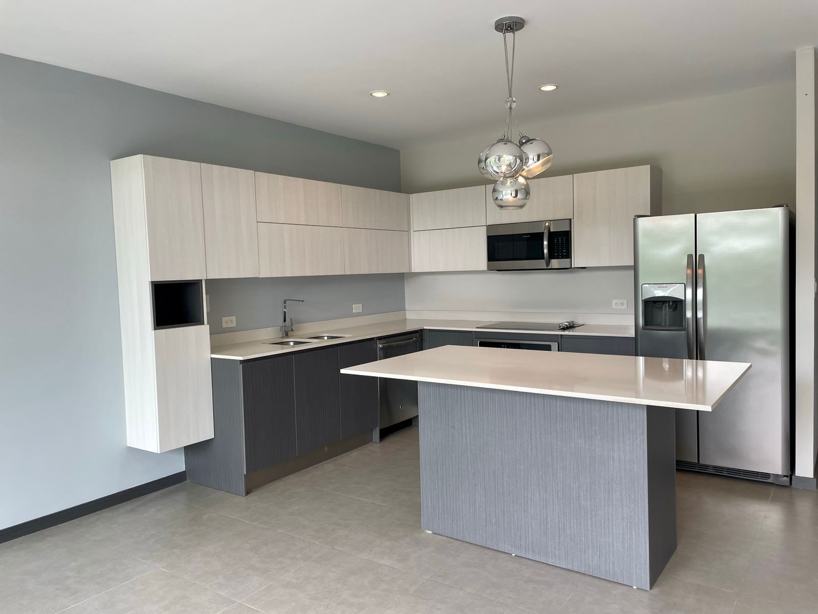 - Fina cocina integrada con sobre en cuarzo y desayunador